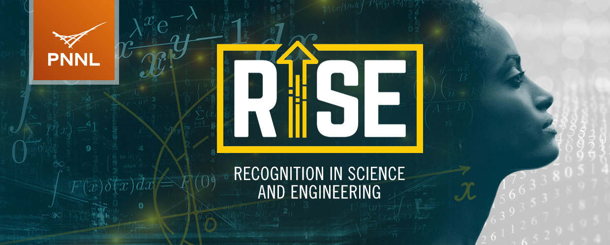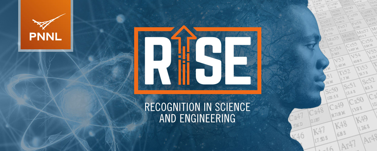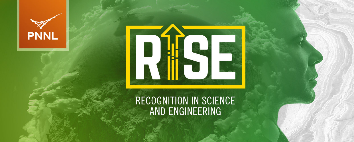 A header set used to highlight RISE, a recognition program at PNNL and utilized within Hubspot. Several areas of research are represented: mathematics, chemistry, nuclear and geoscience.